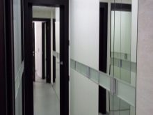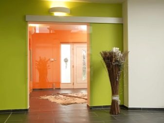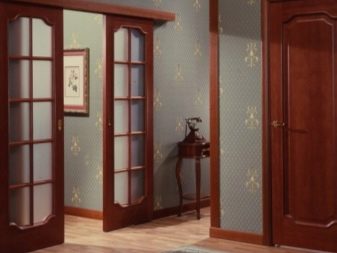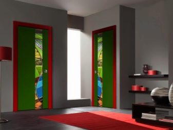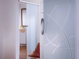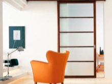 Oft werden Türen mit einer speziellen Öffnung für Glas geschaffen. Glas in verschiedenen Größen ist in den Rahmen eingebaut und macht die Tür wirklich originell und exklusiv. Aber manchmal können Produkte ganz aus Glas bestehen. Solches Material ist für Doppelblattgleitmodelle beliebt. Glas kann opak oder glänzend sein, aber seine obligatorische Eigenschaft ist die Schlagzähigkeit, die durch eine Dicke von mindestens 8 cm erreicht wird.