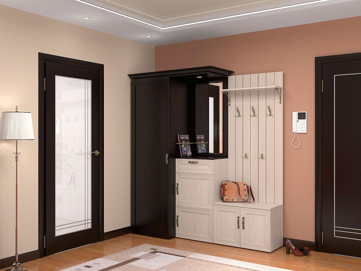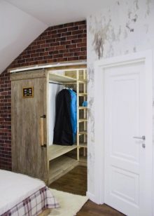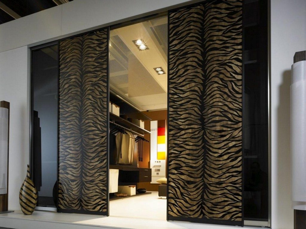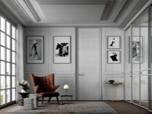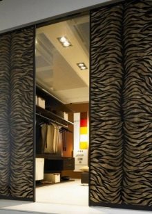 Auch die Türen für ein solches Abteil des Raumes als Garderobe sind verschiedenartig. Schranktüren sind schaukeln, schieben und falten. Oft sind Schiebetüren mit Zeichnungen und Tafeln verziert. Wenn Sie diesen Abschnitt der Tür machen oder Aufmerksamkeit auf sich ziehen, wird sie unter der Oberfläche der Wand maskiert.