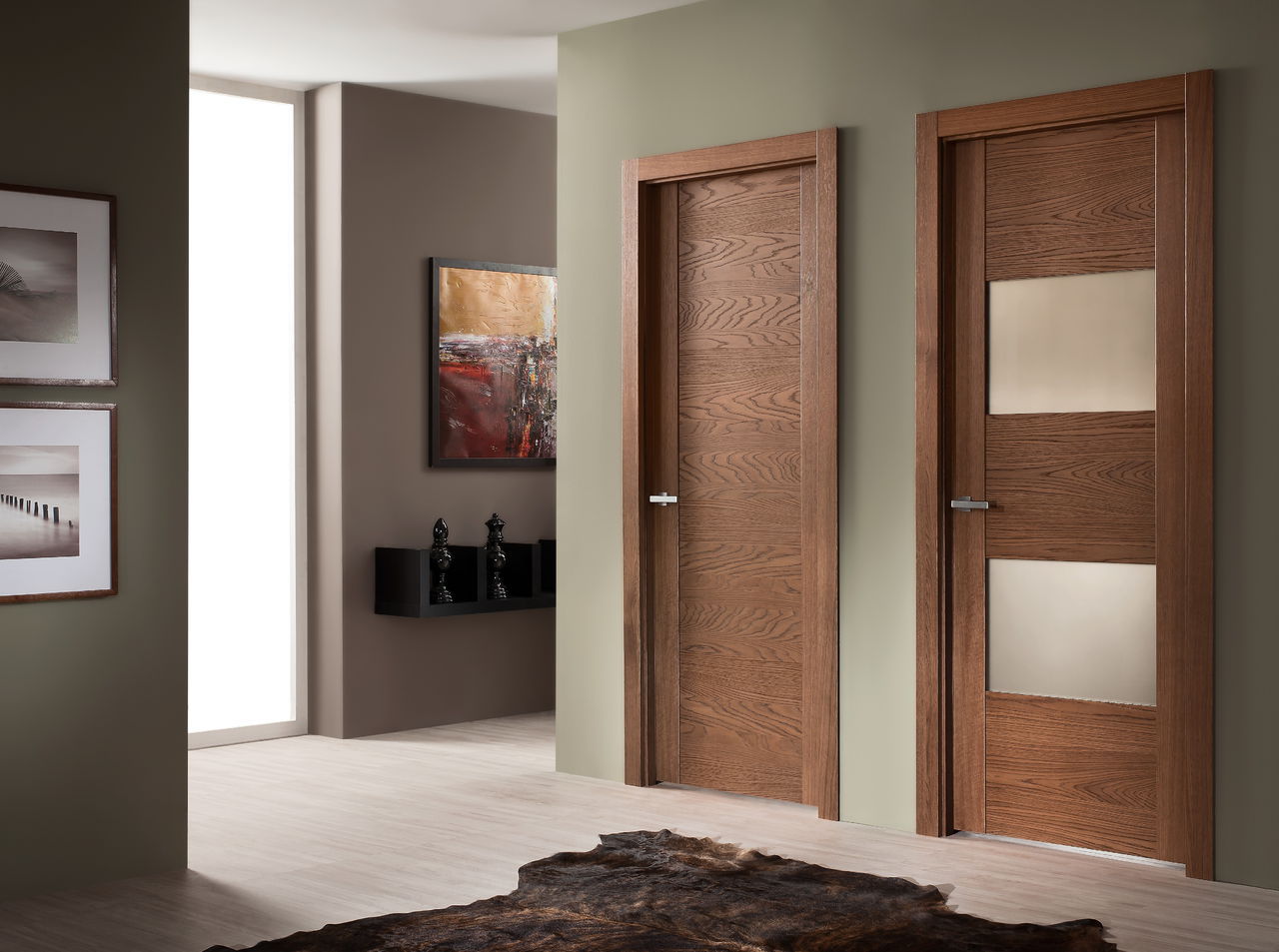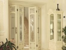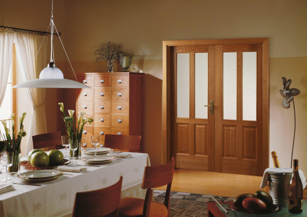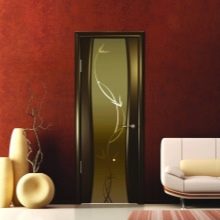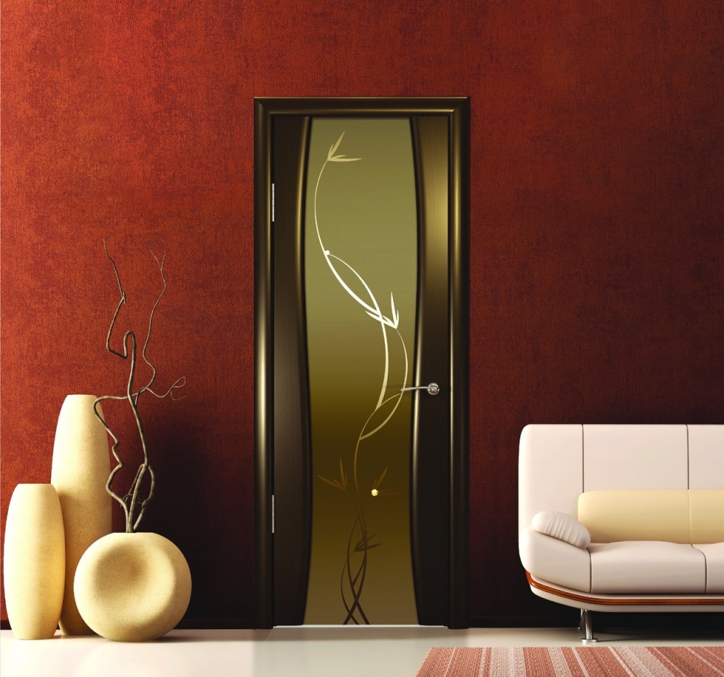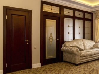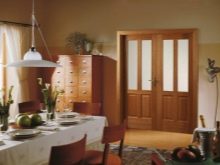 Holztüren lassen sich viel einfacher mit Möbeln kombinieren. Sie können alle Komponenten in der gleichen Art und Farbe mit einem festen Holz der gleichen Rasse aufnehmen. Solch ein Empfang wird Ihrem Zimmer Solidität und Adel geben. Wenn die Geometrie im Raum ausgeprägt ist, dann versorgen Sie den Türrahmen mit geometrischen Glaseinsätzen. Sie werden sich auf die Möbelformen beziehen und das Konzept des Designs ergänzen.