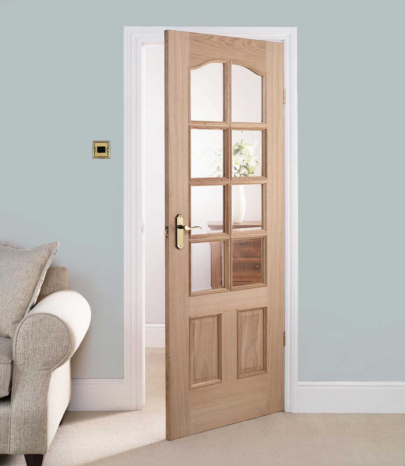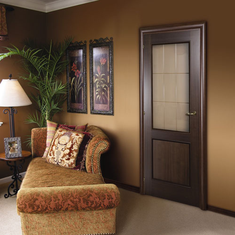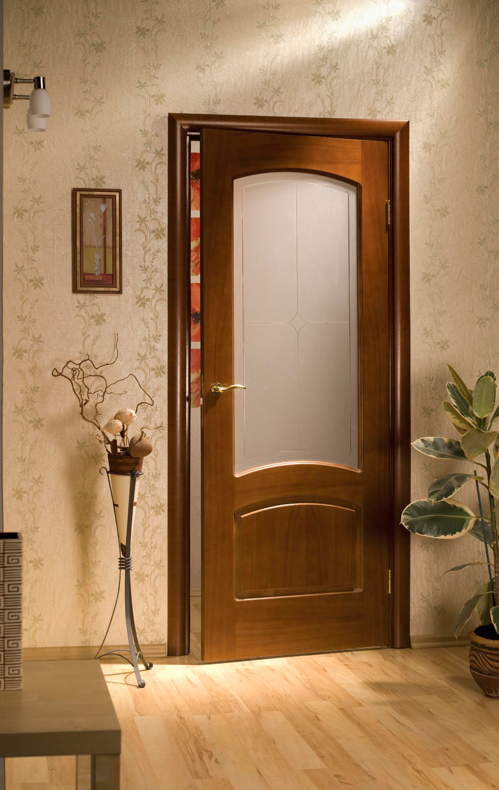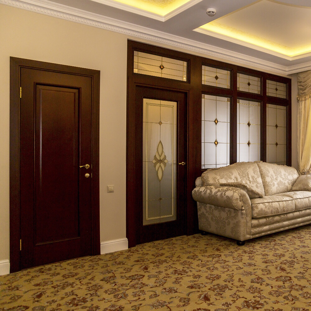 Holztüren lassen sich viel einfacher mit Möbeln kombinieren. Sie können alle Komponenten in der gleichen Art und Farbe mit einem festen Holz der gleichen Rasse aufnehmen. Solch ein Empfang wird Ihrem Zimmer Solidität und Adel geben. Wenn die Geometrie im Raum ausgeprägt ist, dann versorgen Sie den Türrahmen mit geometrischen Glaseinsätzen. Sie werden sich auf die Möbelformen beziehen und das Konzept des Designs ergänzen.