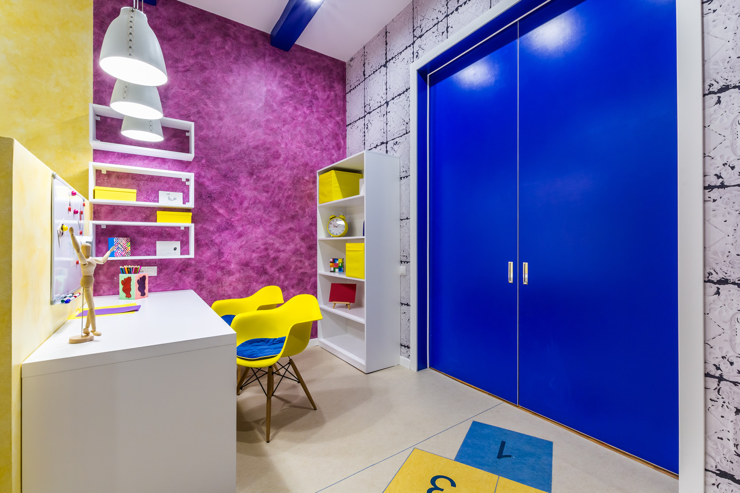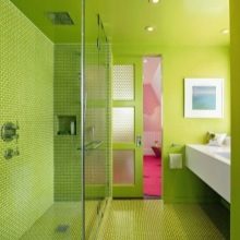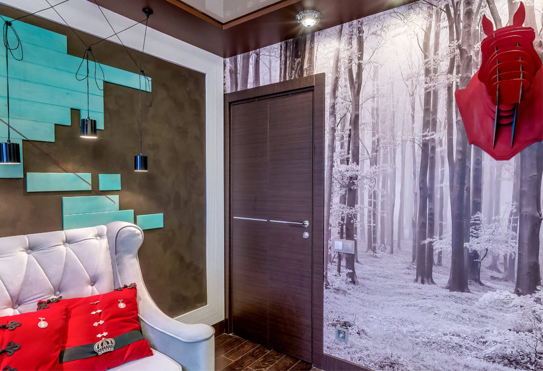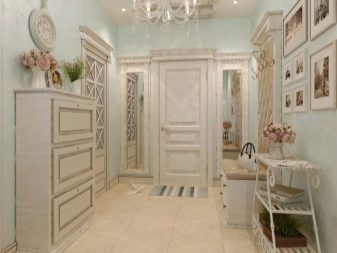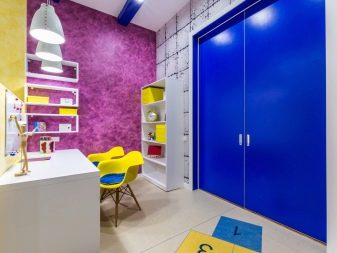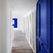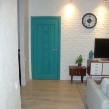 Farbige Türen können mit Hilfe von Accessoires hervorgehoben werden - Gemälde, Figuren, die im gleichen Farbton hergestellt werden. Manchmal können sich Kunststoff- oder laminierte Türen mit kleinen Möbelstücken überschneiden, die in einer glänzenden Ausführung präsentiert werden.