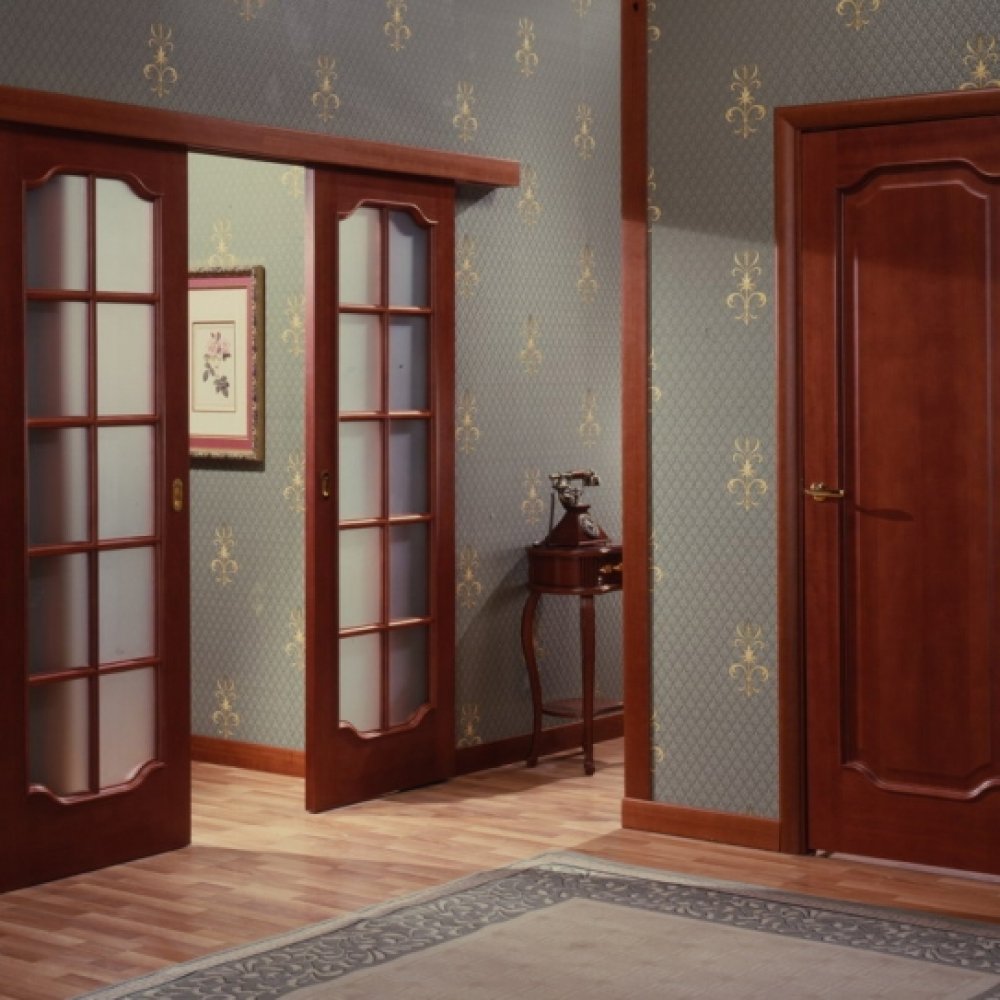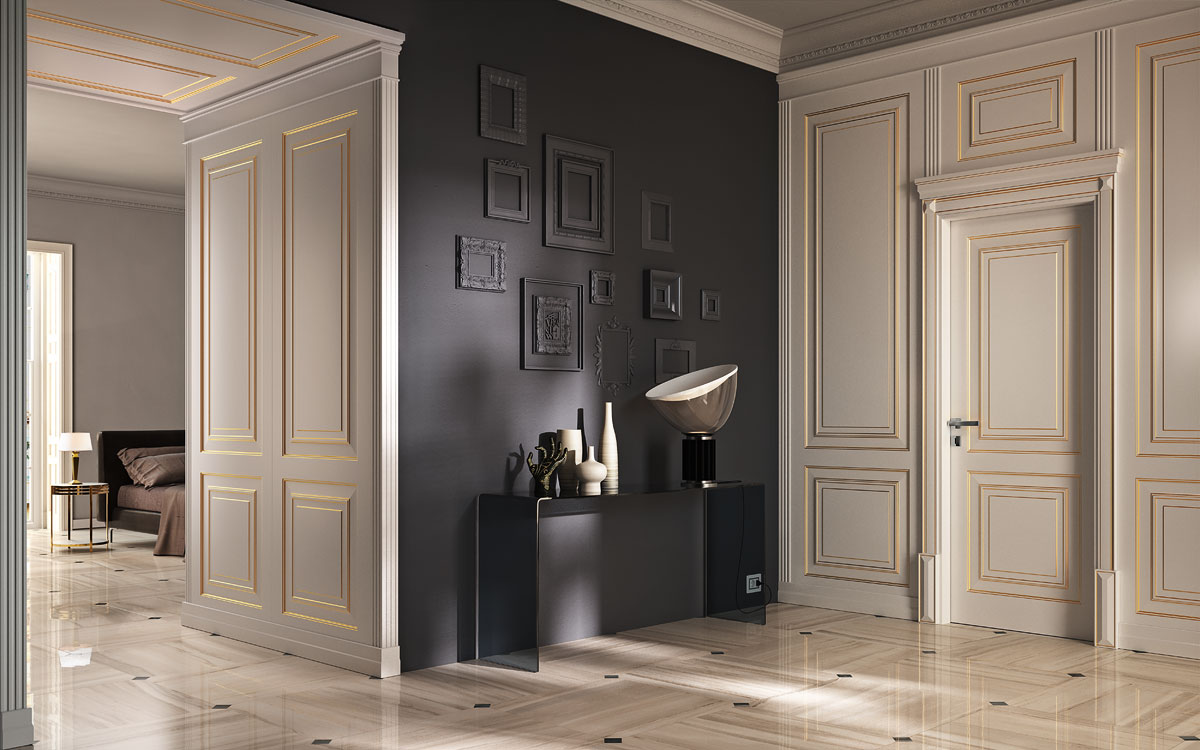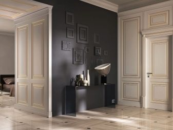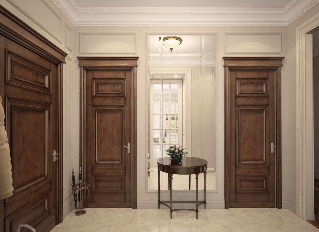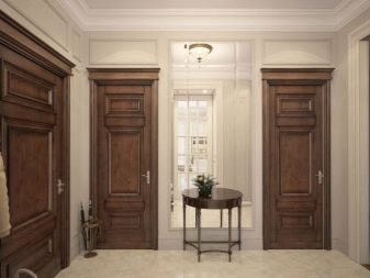 Für klassische Stile zeichnen sich massive Holzprodukte aus. Baroque impliziert geschnitzte Designs aus einer soliden Anordnung. Die vorherrschende Form ist rechteckig. Oft ist die Oberfläche der Tür mit Gold verziert, was ihrem Aussehen einen noch größeren Luxus verleiht.