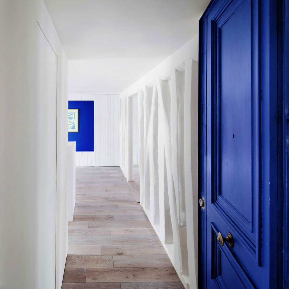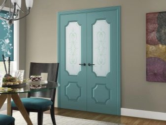 - Türen blau in gedämpften Tönen aufgeführt. Sie können selten auffällige Saphirfarben sehen, aber manchmal ermöglicht ein bestimmter Stil hellere Farbtöne.