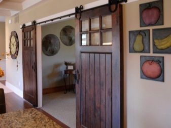 Country-Stil deutet auf Unhöflichkeit in der Gestaltung der Türöffnung hin.Türkonstruktionen bestehen aus großen Brettern, die längs oder quer gestapelt sind. Auf Produkten sieht selten Glanz. Türverkleidungen aus der gleichen Art von Material ragen an den Rändern der Türöffnung hervor und umrahmen die Struktur.
