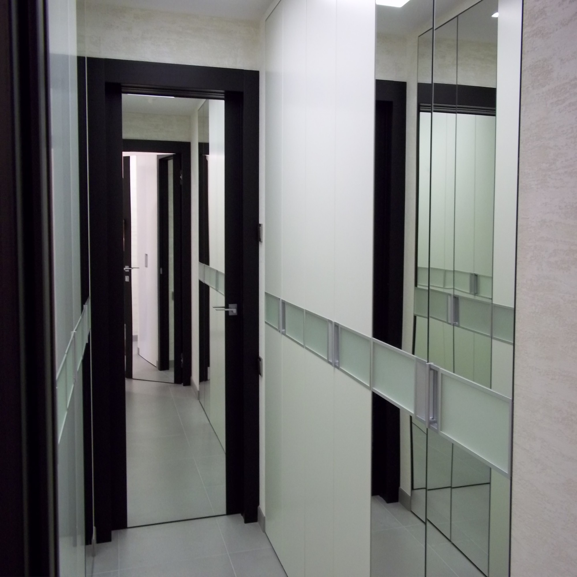 Spiegeldesigns sehen sehr ungewöhnlich aus. Wenn das Produkt komplett aus einem Spiegel besteht, vergrößert es optisch den Raum im Raum, füllt den Raum mit Licht. Einige Modelle sind oben mit einem kleinen Spiegel ausgestattet. Manchmal besteht die Tür aus vielen Spiegeln, die die Verbindungen zwischen den Bauteilen betonen und Spiegelkacheln nachahmen.