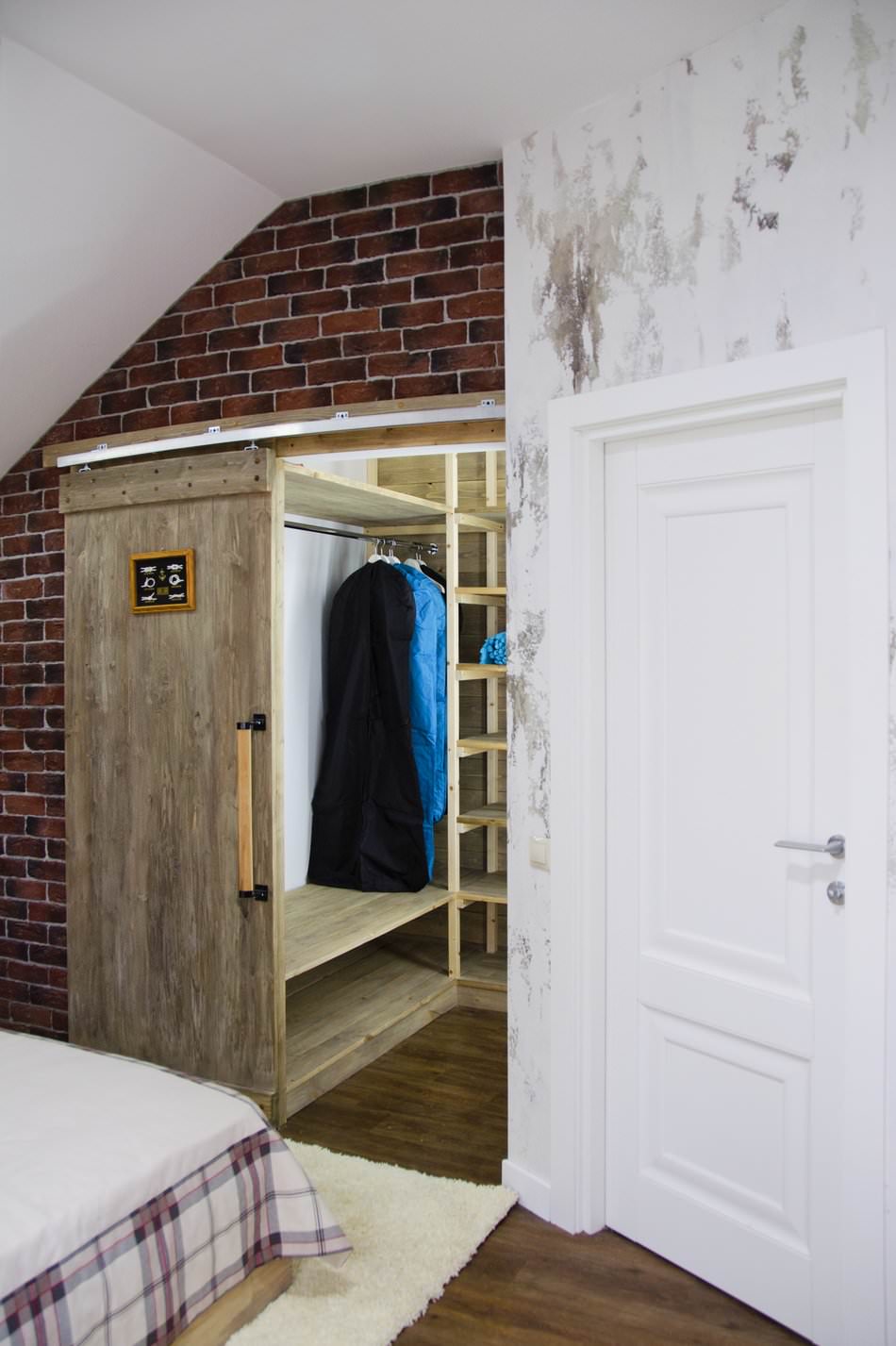 - Von der Seite des Raumes kann eine Tür mit einer größeren Dicke mit Regalen geliefert werden. Wenn Sie Bücher und Accessoires dort platzieren, verleihen Sie dem Design einen Look, der nicht wie eine Tür aussieht.