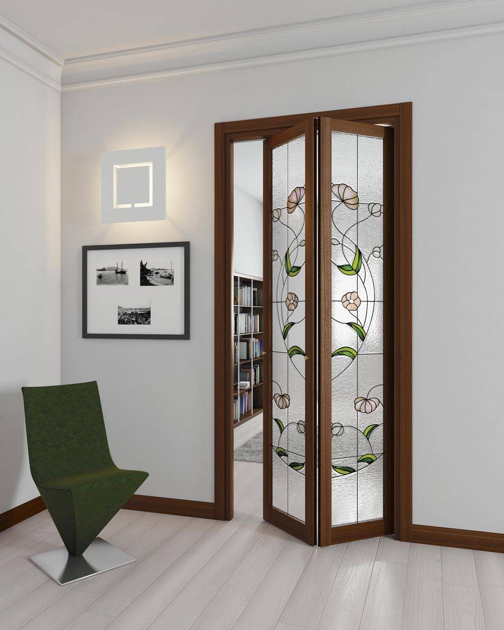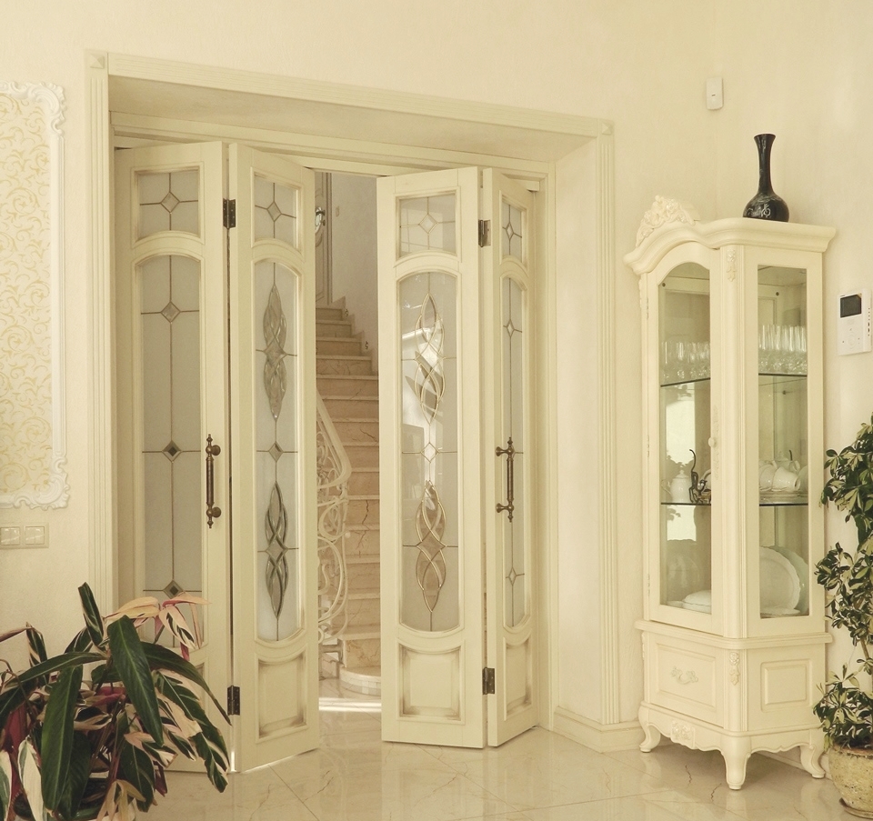 - Entwürfe von durch Faltenart, sind sehr beliebt für das Design von großen Öffnungen. Sie bestehen aus Flügeln, die durch ein Scharnier verbunden sind und sind in zwei Arten unterteilt: