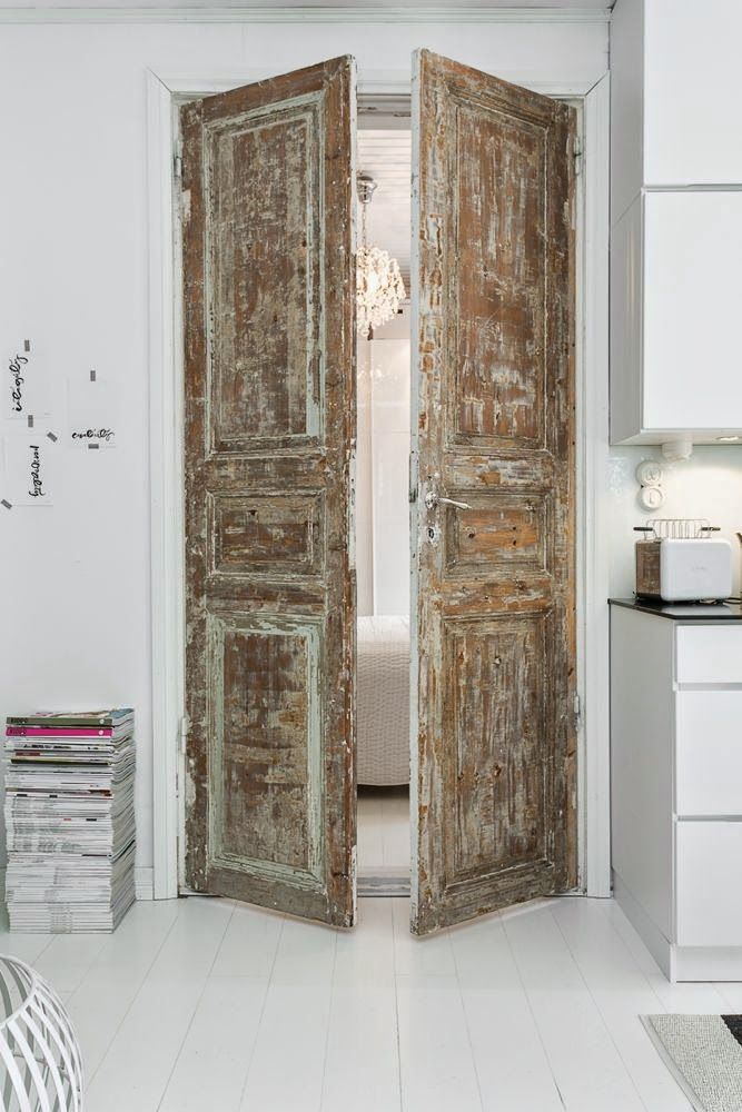 Unabhängig von der Alterung der Tür, können Sie Ihre Phantasie und Kreativität zeigen. Es kann also sehr interessant sein, Akzente im Raum zu setzen. Die Besonderheit dieser Vintage-Türen ist, dass sie eine lange Geschichte tragen. Jeder abgenutzte, gechipt und geknackt ist ein Ereigniswas das Leben einer solchen Holzkonstruktion beeinflusste. Diese Türen können Erinnerungen wachrufen und Sie in eine völlig andere Atmosphäre tauchen.