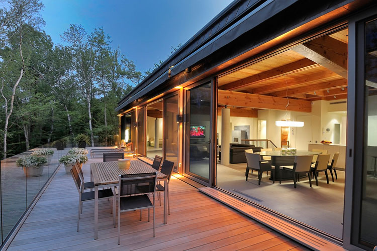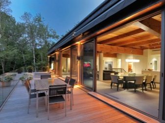 Das sind moderne Panoramafenster, die eine ganze Wand in einem Haus einnehmen können. Sie lassen viel Licht herein, weil sie durch ihr Design französischen Fenstern ähneln. Aufgrund ihrer Größe wird bei Panoramafenstern jedoch nur der Schiebemechanismus verwendet. Dies ist ein sehr stilvolles und ultra-modernes Design des Hauses.