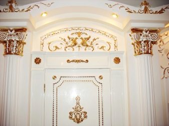 Die fertige Arbeit wird meistens in weiß oder schwarz gemalt. Weiß ist die klassische Farbe von Stuck, die schwer zu verrechnen ist. Gleichzeitig verleiht die letztgenannte Option dem Design eine besondere Eleganz und erweitert die stilistischen Möglichkeiten des Produkts. Zum Beispiel kann schwarzes durchbrochenes Modellieren im Art-Deco-Interieur angewendet werden, das sich durch ein luxuriöses Finish auszeichnet. Im Design wird das Formen immer mit Luxus assoziiert. Individuelle Akzente können mit Gold behandelt werden. Dies wird zu einem klassischeren Portal führen.