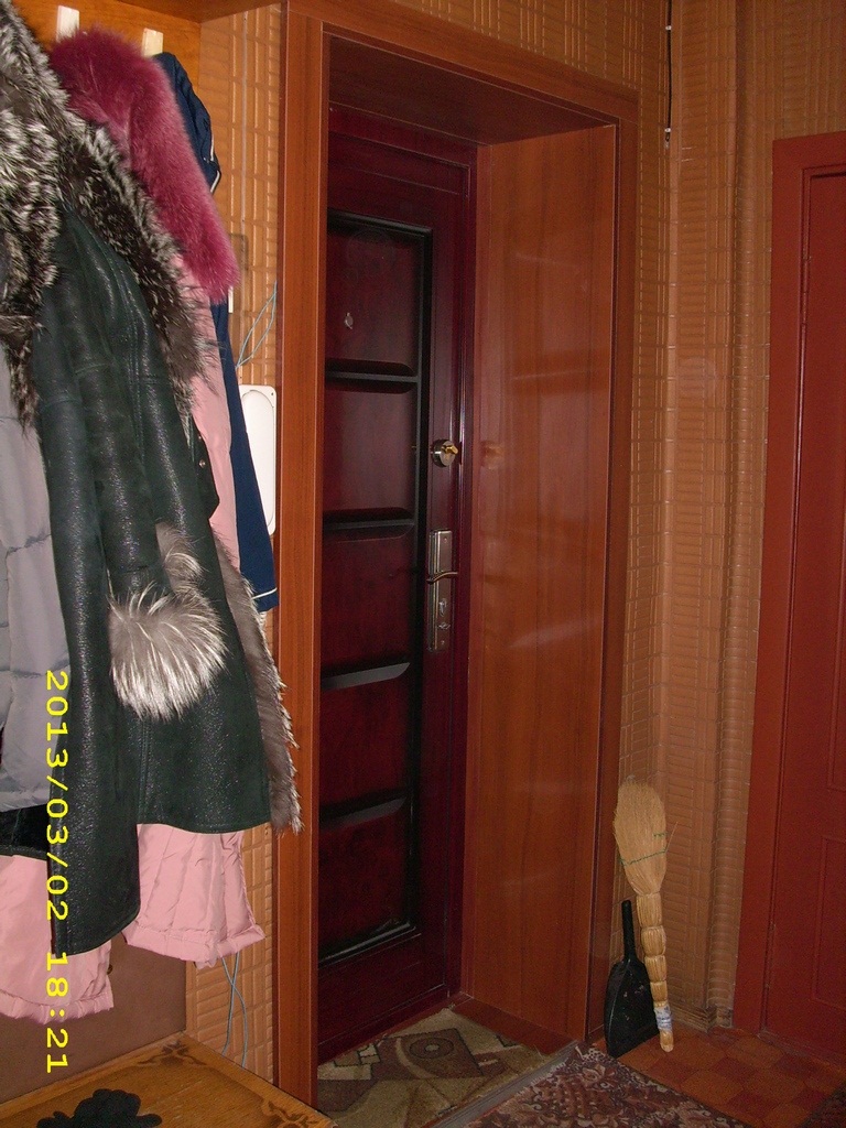 Der Türrahmen muss in diesem Fall nicht aus weißem Kunststoff sein.Es kann unter dem Holz getrimmt werden, wenn es für die Harmonie des umgebenden Innenraums erforderlich ist. Visuell unterscheidet sich dieses Design nicht von natürlichem Holz.