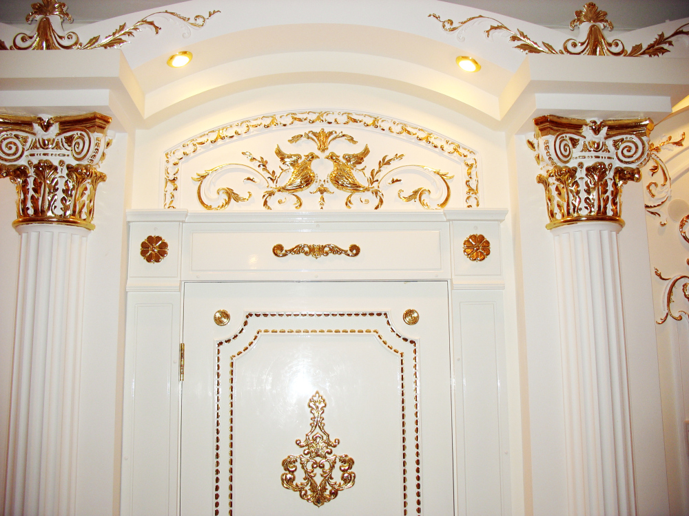 Gips Stuck kann in einer begrenzten Liste von Innenräumen verwendet werden.Dazu gehören barocke und klassische sowie griechische und römische Stile. Bei dieser Technik werden Dekorationen in Großbuchstaben hergestellt.