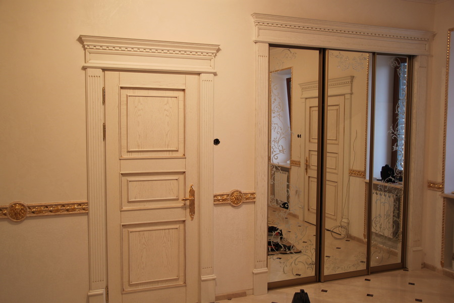 Das Portal an der Tür sieht wie ein zusätzlicher Rahmen mit einem breiten Gesims im Querteil der Tür aus, das die Hauptsemantik trägt.Dieser Teil des Portals kann auf verschiedene Arten zugeschnitten werden, abhängig vom Stil des Interieurs, den Vorlieben des Besitzers und den finanziellen Möglichkeiten. Allerdings muss gesagt werden, je komplexer und luxuriöser das Design dieses Teils des Raumes ist, desto profitabler sieht das Portal aus.