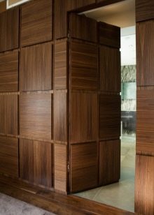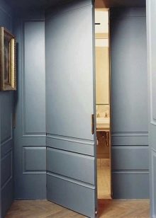 - Schaukelkonstruktion. Die günstigste Variante ist die übliche Drehtür, die weniger sichtbar ist und weniger von der Wand absteht. Nur ein Stift, ein Schloss oder eine auffällige dünne Kontur kann es ausgeben.