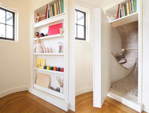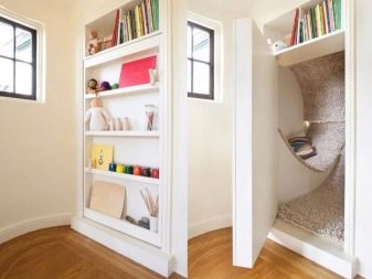 Dieses Designphänomen hat eine spezielle Anwendung in Kinderzimmern gefunden, weil ein versteckter Raum, in dem Sie alles schaffen können, was Sie wollen und nicht gefunden werden, der Traum jedes Kindes ist. Von Ihrer Seite wird es sehr nachdenklich und im Allgemeinen erstaunlich, Ihr Kind ein verstecktes Zimmer zu organisieren - am wichtigsten, erinnern Sie sich an sich, wo sein Schlafzimmer liegt, so dass er nichts Gefährliches tut.