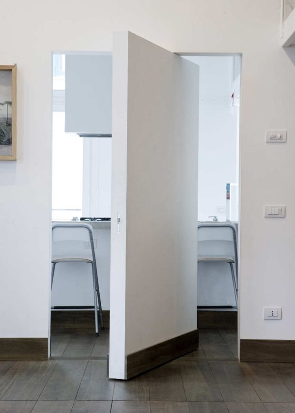 Es sind die Pendeltüren, die meistens in großen Supermärkten installiert werden, und auf dieser Grundlage können Sie sich vorstellen, wie gut dieses Design in einer versteckten Version aussehen wird. Diese Türen sind übrigens nicht besonders schalldicht.