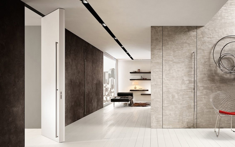 - Roto-Tür. Eine ziemlich teure Option, vielleicht die teuerste, aber auch das größte Interesse. Im Allgemeinen sind Roto-Türen Flügeltüren, deren Mechanismus dem Drehkreuzmechanismus in der U-Bahn sehr ähnlich ist. Die Leinwand dreht sich tatsächlich einfach um ihre Achse auf einem Scharnier. Sie sind sehr bequem zu öffnen - Sie können einfach Ihre Schulter drücken und sanft in den Raum fallen, was zweifellos sehr praktisch für relativ versteckte Türen ist, weil es keine Griffe gibt, die hier auffallen könnten. Meistens sind sie mit einem Magnetverschluss ausgestattet, der Dichtigkeit garantiert.