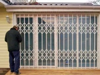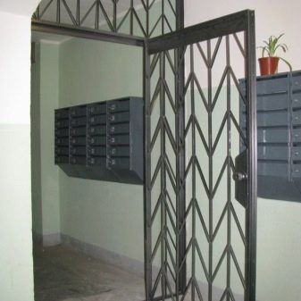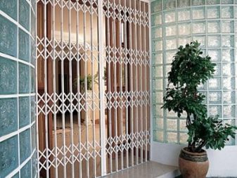 Schiebe Gittertüren sind ziemlich schwierig herzustellen. Der Mechanismus funktioniert mit Hilfe von beweglichen Hebeln, die das Prinzip der gewöhnlichen Schere wiederholen, das Türdesign besteht aus einer Reihe von beweglichen Gelenken. Aus diesem Grund wird die Leinwand zu einem dünnen Streifen gefaltet, der den Eindruck einer Schiebetür vermittelt. Einfaches Öffnen ermöglicht die Installation zusätzlicher Rollen. Schiebegitter sind sehr komfortabel und schützen den Raum vor unbefugtem Zutritt. Aber auch sie haben positive und negative Eigenschaften.
