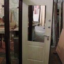 - Das Anbringen von Beschlägen an einer solchen Tür ist ziemlich schwierig. Wenn der Spiegel viel Platz in Anspruch nimmt, ist das Anbringen des Gucklochs und des Türgriffs ziemlich problematisch und nicht immer praktisch. Das Guckloch befindet sich in der Regel im Seitenteil und hat keinen großen Blickwinkel.