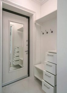 Der Eingangsspiegel ist ein interessanter Entwurf, der die Herzen der Verbraucher überflutet hat. Solch ein Element wird den Raum erweitern, sich auf die Tür konzentrieren und nutzbaren Raum sparen.