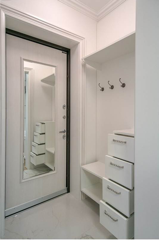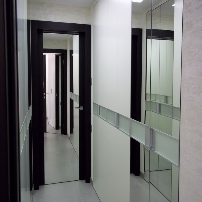 - Praktikabilität. Möbel mit einem Spiegel brauchen ziemlich viel Platz. Diese Option ist äußerst unpraktisch.Spiegel-Finish in der Tür löst dieses Problem.
