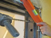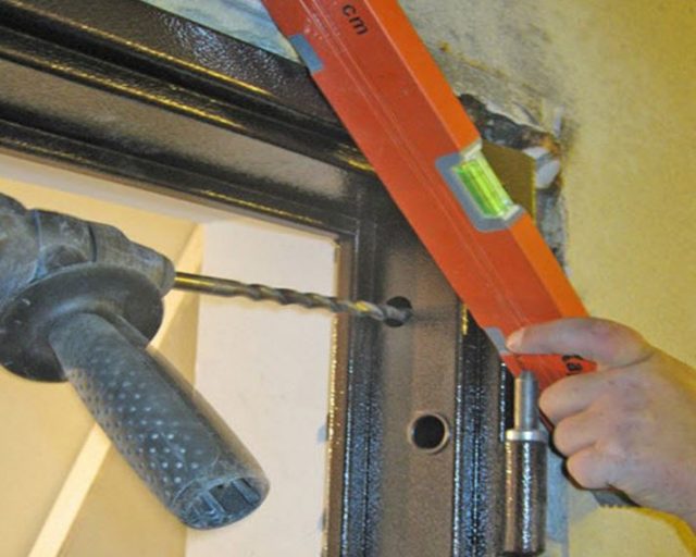 - Weiter ist es notwendig, das Türblatt im Gehäusekasten zu befestigen. Dies geschieht mit Hilfe einer starren Fixierung. Bohren Sie Löcher durch spezielle Befestigungspunkte, die sich im Rahmen befinden. Sie werden für Anker und Bolzen benötigt.