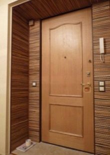 - Naturholz. Dies ist das teuerste und sehr prestigeträchtige Veredelungsmaterial für Eingangstüren. Das Material besticht durch seine natürlichen Muster und eine Vielzahl von verwendeten Baumarten. Naturholz kann stilvoll betont und seine Lebensdauer verlängert werden. Dazu können Sie beispielsweise den Fleck verwenden.