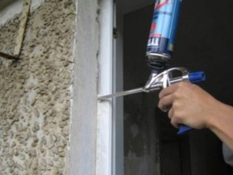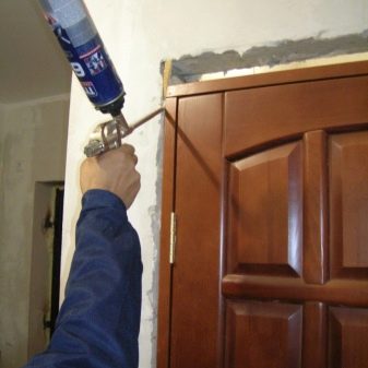 - Mit normal schließenden Türen können Sie zur nächsten Stufe übergehen. Mit einer Spezialpistole muss der Raum zwischen der Box und dem Rahmen mit Montageschaum gefüllt werden. Die Arbeit wird von der Oberseite des Produkts durchgeführt. Die Naht ist nur zur Hälfte gefüllt, und dann muss man auf die Aushärtung des Schaumes warten.