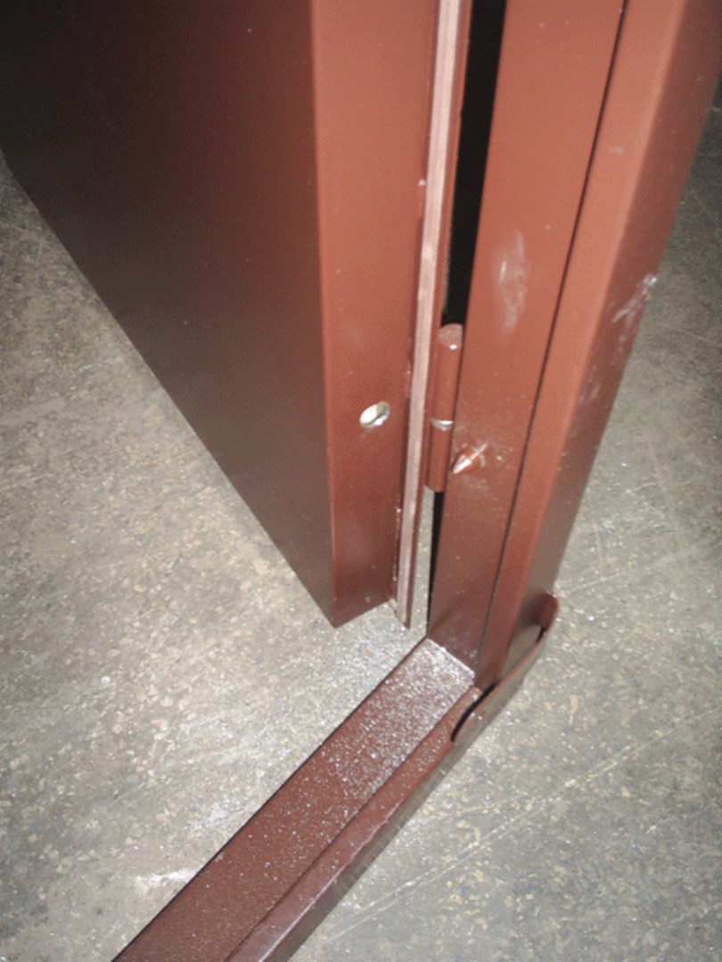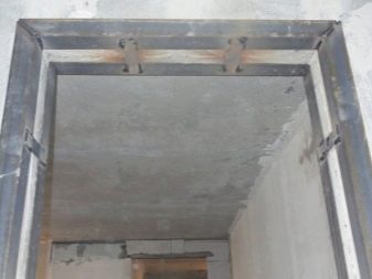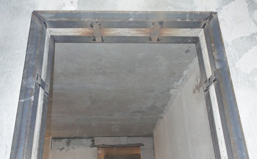 - Die Öffnung muss gestärkt werden. Dazu passt eine geschweißte Konstruktion. Es wird in Form eines Hufeisens durchgeführt. Auf der Türöffnung ist es im Futter installiert.