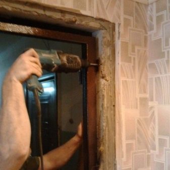 Diese Methode hat auch mehrere Nachteile. Alle Löcher, die Sie gebohrt haben, befinden sich sehr nahe an der Wand. Wenn Sie das Türblatt so verlegen, dass Sie Ziegel- oder Gasbetonwand benötigen, wird die Halterung nicht dauerhaft sein.