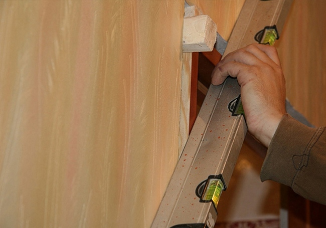 - Nehmen Sie eine Ebene und messen Sie sorgfältig die Position des Rahmens in der Türöffnung. Richten Sie den Rahmen anhand dieser Messungen aus. Dies sollte horizontal zum Boden sowie vertikal zur Wand erfolgen. Fixieren Sie die gewünschte Position des Produkts mit Keilen, am besten aus Holz. Schließen Sie danach die Tür.