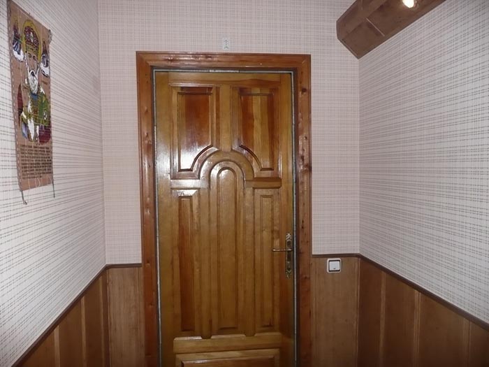 - Die Tür zum Blockhaus wurde oft in der Sammlung gekauft. Es besteht aus einem Rahmen mit Schleifen und Leinwänden. Spezielle Öffnungen sind immer im Rahmen vorgesehen. Sie sind für die Montage vorgesehen.