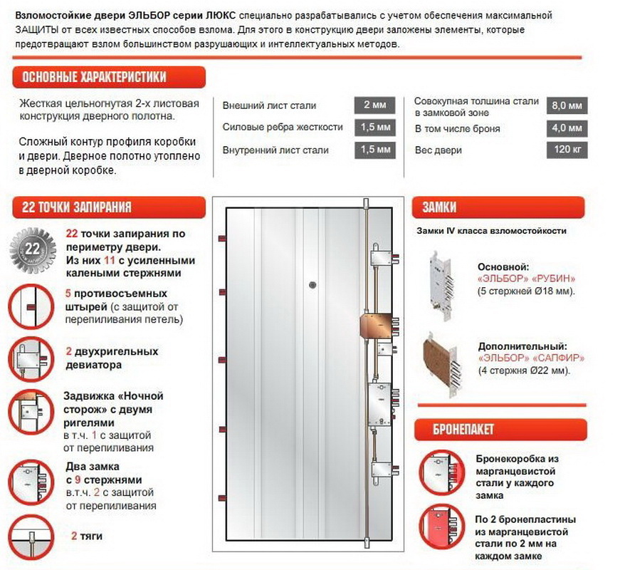 In der Regel sind Sondertüren mit 2 Arten von Schlössern ausgestattet: Haupt- und Nebenschließungen. Das Hauptschloss muss mit 2 Schlüsseln und geheimen Mechanismen verschiedener Typen ausgestattet sein. Für die Zusatzsperre genügt ein geheimer Teil.