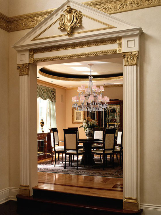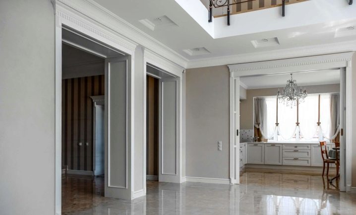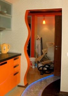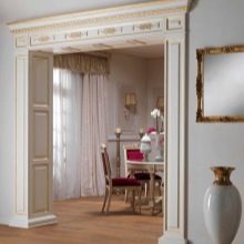 Der größte Spielraum für Experimente öffnen Portale von Trockenbau. Sie können mit einer Vielzahl von dekorativen Elementen getrimmt werden, wie geformten Baguettes und Verkleidungen aus Polyurethan, leichten Texturpaneelen, die für verschiedene natürliche Designs stilisiert sind, und dergleichen. Die einzige Einschränkung ist das Gewicht der Verkleidungsteile. Gipsplatten - das Material ist ziemlich zerbrechlich, so dass es einer großen Masse von Elementen nicht widerstehen kann.