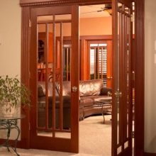 - Wenn Sie Doppeltüren in einer engen Öffnung installieren müssen, sollten Sie kein Faltmodell wählen. Die beste Wahl in diesem Fall wären japanische Schiebetüren, Abteiltüren. Es ist möglich, ein Türblatt mit verschiedenen Rollläden zu installieren, zum Beispiel kann eine 60 cm breit und die andere 80 cm breit gemacht werden.