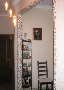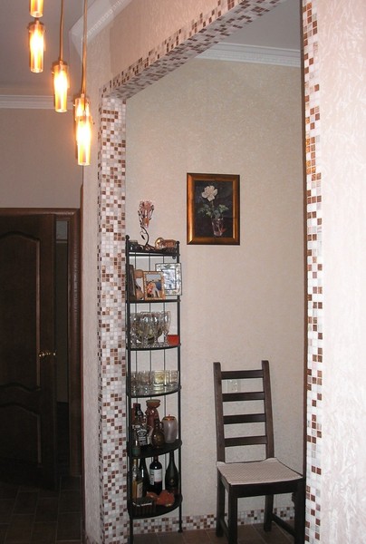 Für die Wände aus Ziegeln öffnen größere Auswahlmöglichkeiten. Sie können leicht eine Öffnung für die Türen des natürlichen Arrays machen. Eisenstrukturen aus dem Profil entlang der Kontur verursachen ebenfalls keine größeren Probleme. Es ist wichtig zu beachten, dass Ziegelstein das schwerste Material ist, daher ist es zwingend erforderlich, oben einen Jumper zu installieren. Ein solcher Verdichter wird die gesamte zuvor an die feste Wand angelegte Last übernehmen. Eine interessante Lösung für Innentüren ist ein Mosaik entlang der Kontur der Öffnung, das Unregelmäßigkeiten im Falle von Fehlern bei Reparaturen abdeckt.