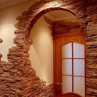 Die steinerne Tür sieht spektakulär mit und ohne Tür aus. Nachahmung von Naturmaterial sieht nicht weniger attraktiv als ein teurer echter Stein, aber es ist für fast jedermann erschwinglich. Das Design des Portals entspricht dem Design des Spiegels einer ungewöhnlichen Form, die der wahre Akzent des Flures ist.
