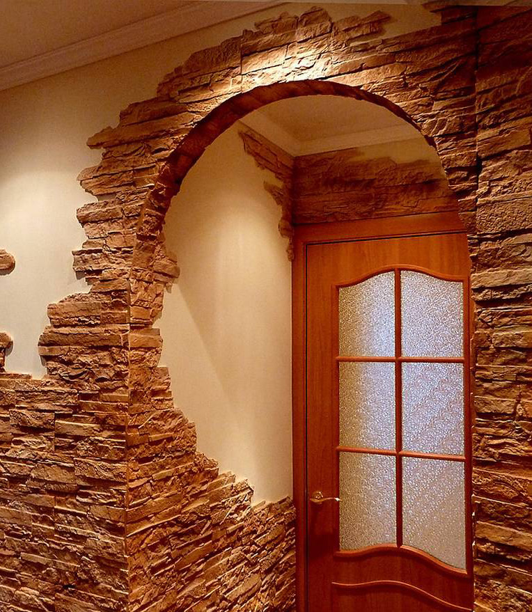 Ein spezielles Training ist nicht erforderlich: Stein kann mit Unregelmäßigkeiten und Rissen direkt auf die Wände gelegt werden, er deckt alle Mängel vollständig ab und hält fest. Es sollte Stein auf beiden Seiten der Türöffnung gelegt werden, dieses schafft eine harmonischere und natürliche Zusammensetzung.