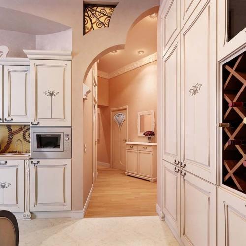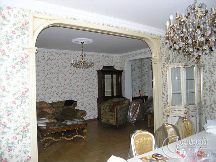 Das traditionelle Portal, ergänzt durch eine geschwungene Oberkante, kann in der klassischen Form nicht als Bogen bezeichnet werden.Es ist leicht ungewöhnlich macht das Interieur so frisch und modern. Die Anwesenheit mehrerer ähnlicher Portale vereint den gesamten Raum und öffnet ihn von der neuen Seite. Der Stuck an der Kontur aus Polyurethan ist den Möglichkeiten edler Muster nicht unterlegen.