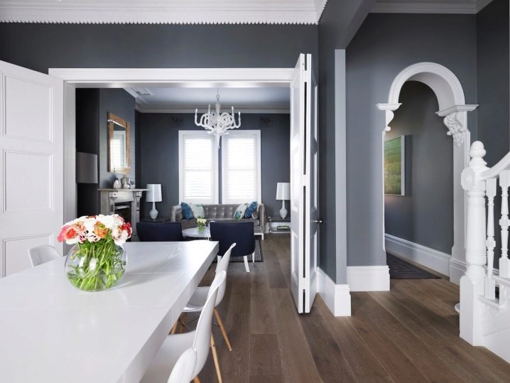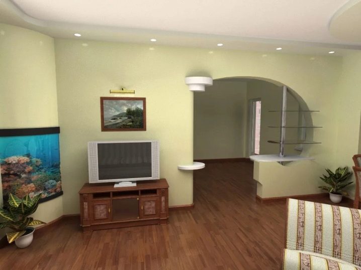 Gipskarton-Designs ermöglichen es Ihnen, die Aufmerksamkeit direkt von der Öffnung abzulenken und die Illusion eines einzelnen Raums im Gebiet von zwei kombinierten Räumen zu schaffen.Gipskartonblenden ergänzen häufig die anderen Ausführungen, beispielsweise geklebte Polyurethan-Formteile unter den Formteilen.