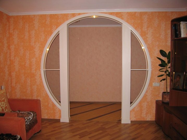 Die interessanteste Interpretation ist gemusterte Öffnungen. Sie können in verschiedenen Konfigurationen ausgeführt werden, einschließlich äußerst komplizierter, beispielsweise in Form eines Schlüssellochs. Verschiedene Designs beinhalten die Schaffung von Portalen mit Regalen, Nischen, dekorativen geschwungenen Elementen und so weiter. Ein besonderes Merkmal ist die Unfähigkeit, ein anderes Material als Trockenbau zu verwenden. Anspruchslose Wände können bei der kleinsten ungeschickten Bewegung einfach zerbröckeln, während es üblich ist, Öffnungen mit allerlei kleinen Monogrammen und Perforationen zu machen.