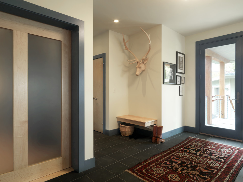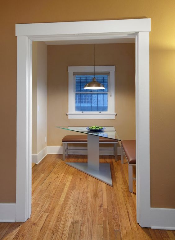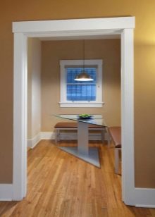 In der Regel wird die Einfassung der Türöffnung an die Farbe des Türblattes angepasst oder bei fehlender Tür an die Wandverkleidung angepasst. Aber eine kontrastierende Kombination aus Lichteinfall und dunkler Tür und umgekehrt wird sehr hell und ungewöhnlich aussehen. Im Gegensatz dazu können Sie anders spielen. So sehen helle Türen auf dem Hintergrund eines dunklen Bodens gut aus. Sehr oft werden sie im Gegensatz zu einer Wandverkleidung ausgewählt.