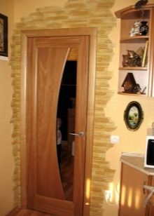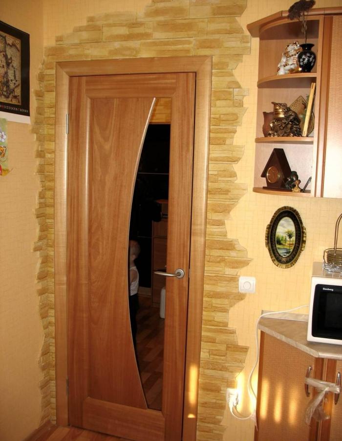 Ein weiteres Merkmal des Finish ist, dass es in einer Stufe durchgeführt wird. Danach müssen Sie sich nicht um die Struktur kümmern, wie es bei den Türen der Fall ist. Bei der Herstellung und Verarbeitung können Sie absolut beliebige Materialien verwenden, es gibt keine Einschränkungen. Darüber hinaus ist die Dekoration anders, da es sehr einfach ist, jeder kann es alleine machen.