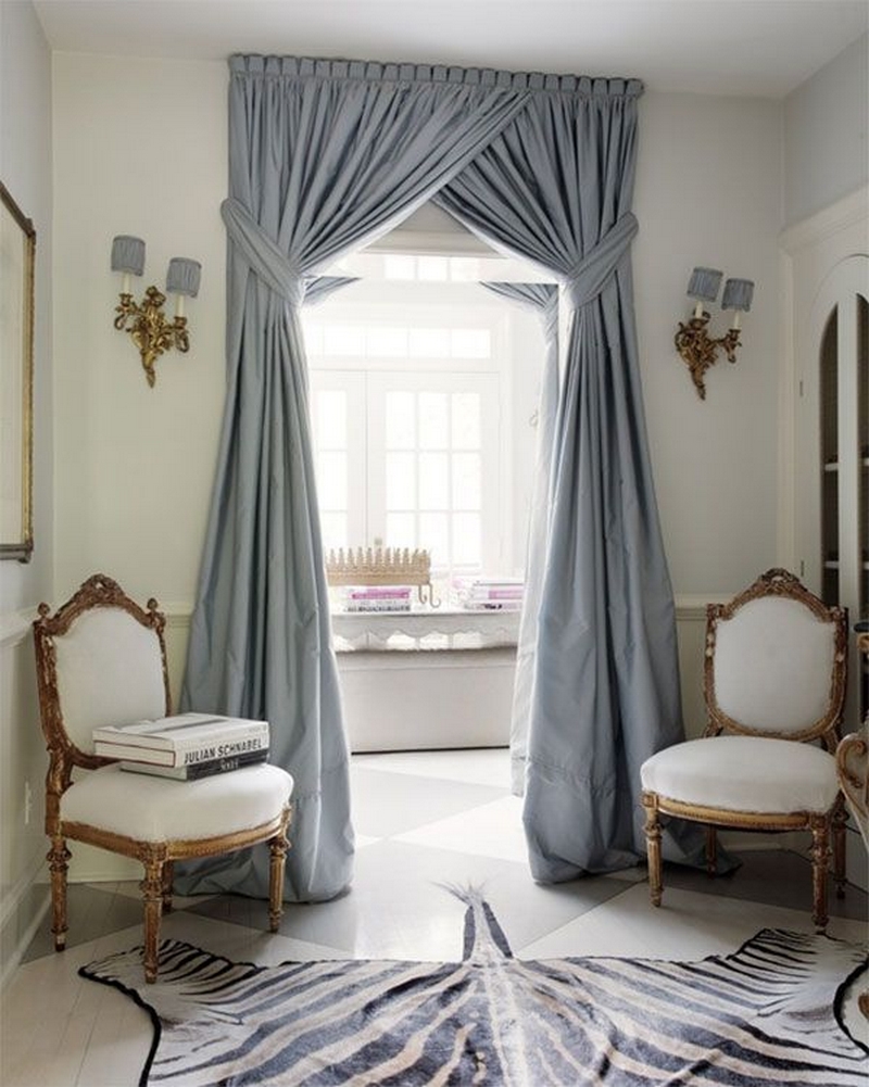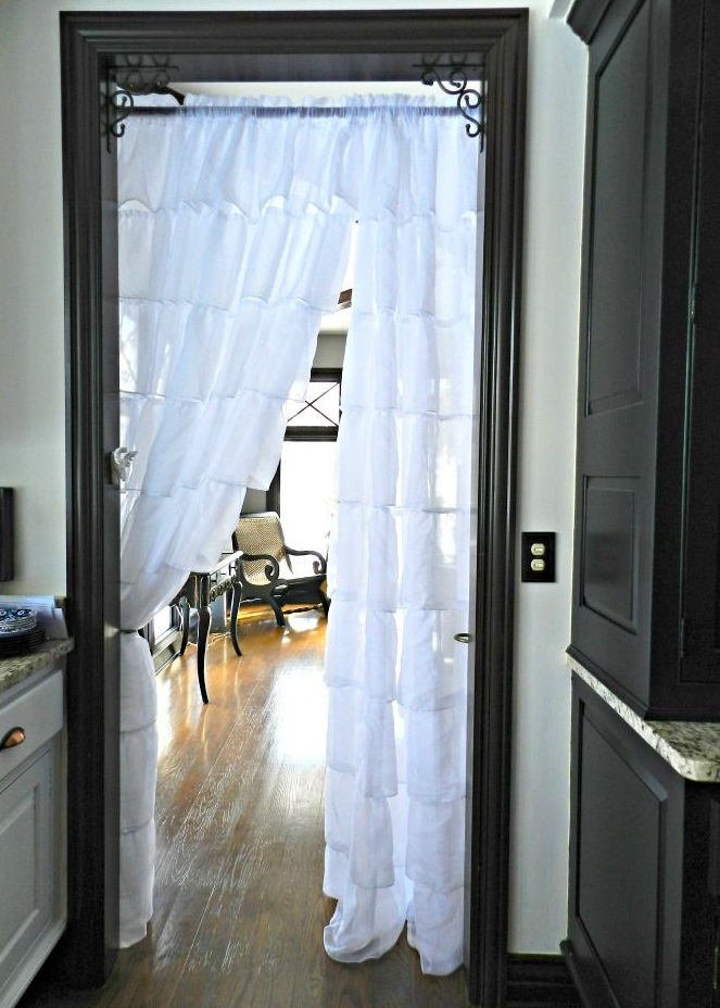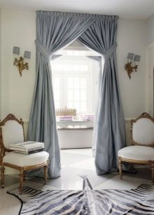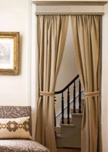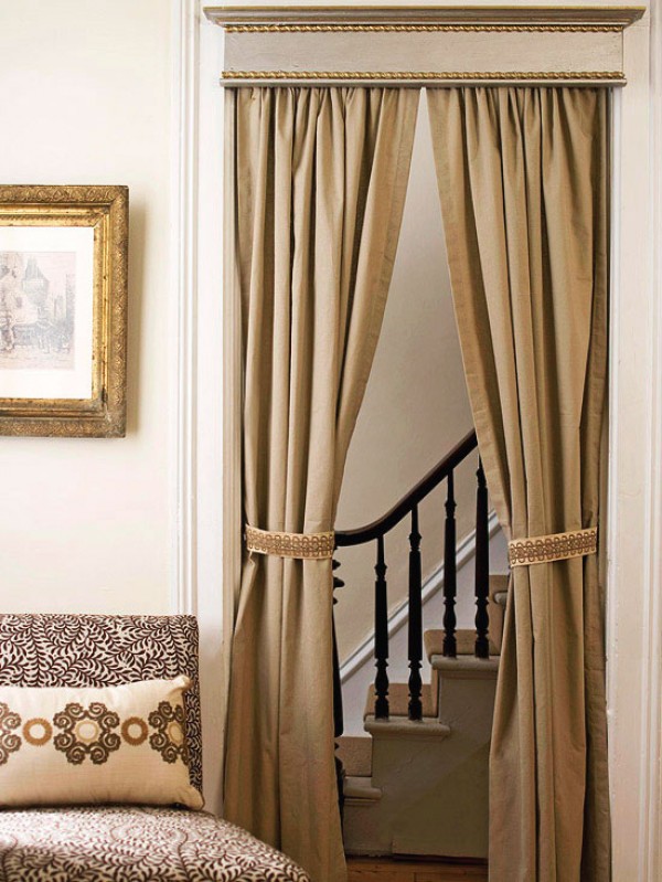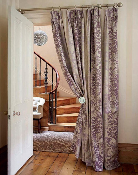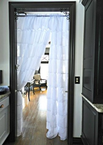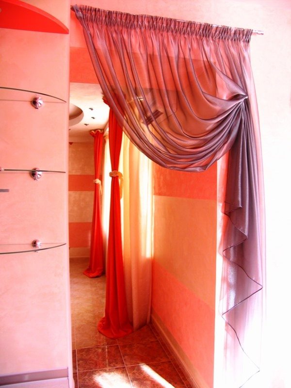 Für einen Raum, der nicht streng in der Art ist, ist es besser, ein leichteres Design, wie einen Bogen oder Textilien zu wählen. Vorhänge können jeden Raum verändern. Sie werden jede Tür perfekt ersetzen.