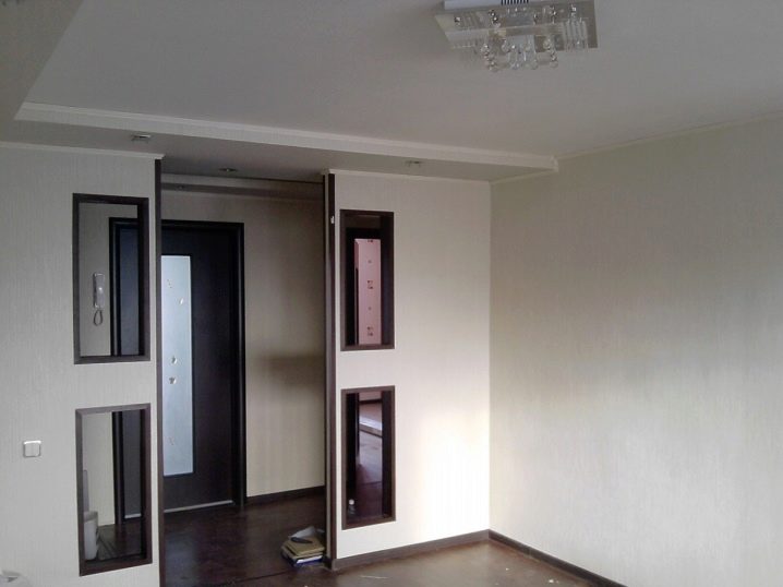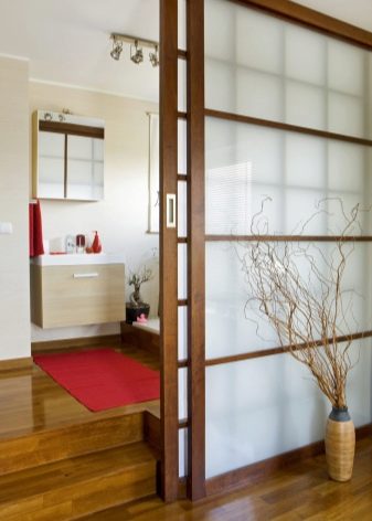 Auch die Türöffnung ist nach dem Prinzip eines geschlossenen Typs gestaltet. In diesem Fall ist es mit Bildschirmen und Partitionen gefüllt. Diese Lösung ist ideal für die Zoneneinteilung von Räumen und Ausscheidungen verschiedener Funktionsbereiche. Die Besonderheit der Dekoration der Türöffnung ist, dass sie immer ursprünglich in der Form eines Rechtecks ist.