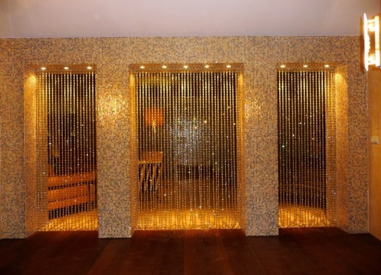 Normalerweise wird eine solche Fliese in Analogie zum Mauerwerk ausgelegt. Ein solches Analogon sieht ziemlich ungewöhnlich und glaubwürdig aus. Außerdem werden glatte Fliesen verwendet, um die Tür zu vervollständigen. In diesem Fall ist es Mosaik ausgelegt. Dieses Design sieht sehr hell und spektakulär aus.