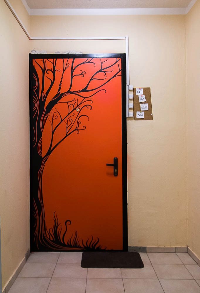 Wenn Möbel unterschiedlicher Farbe in verschiedenen Räumen installiert werden, haben benachbarte Räume unterschiedliche Gestaltung von Wänden und Böden, in diesem Fall wird eine Tür mit unterschiedlicher Gestaltung beider Seiten verwendet.Jede Seite, die sich in einem bestimmten Raum befindet, ist wie das allgemeine Interieur und das Farbschema des jeweiligen Raumes gestaltet.