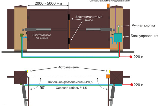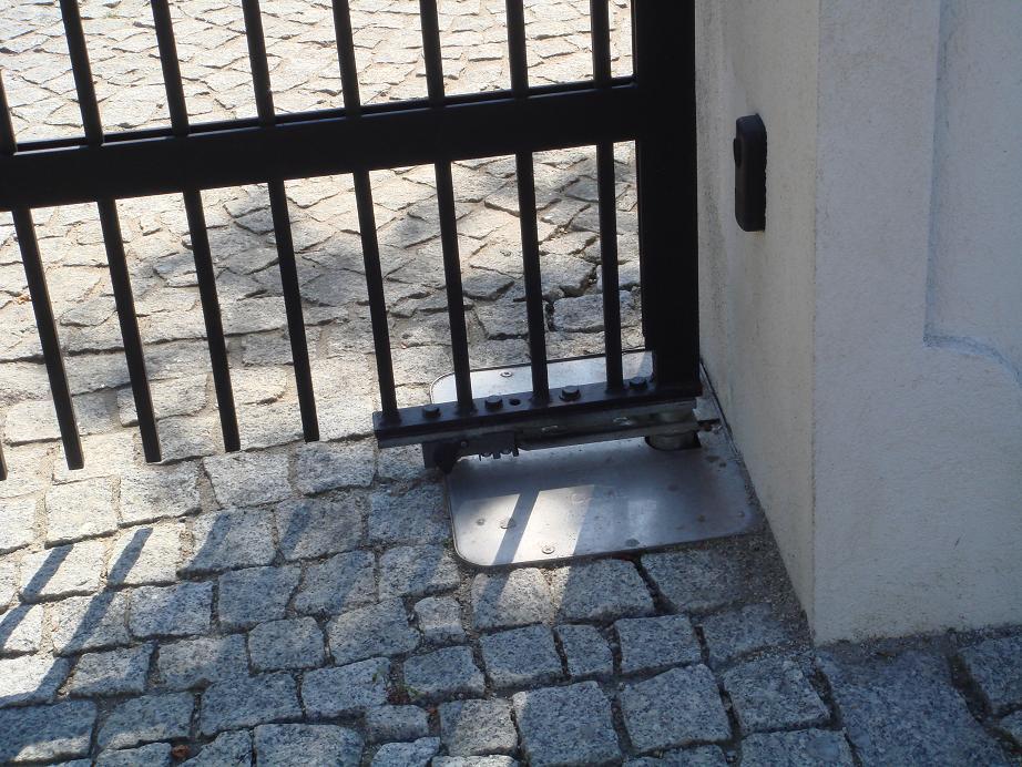 Ein linearer Elektromotor wird an zusätzlichen Pfosten installiert, was Platz auf der Baustelle spart. Ein signifikanter Nachteil in diesem Fall ist jedoch die Beschränkung des Öffnens des Tors auf 90º. Der Winkel der Bewegung bindet den Durchgang von breiten Autos.