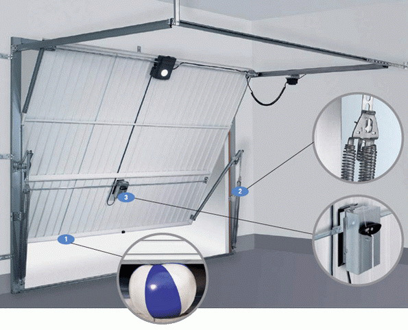 Wenn Sie den Flügel öffnen, nimmt der Flügel eine horizontale Position ein und reicht bis zur Decke.Der Mechanismus wird durch Federn, Rollen und Führungen angetrieben. Letztere bestimmen die Position des Tores und übertragen sie von der horizontalen in die vertikale Ebene und zurück.