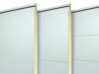 "Warme" Leinwände haben eine zusätzliche Isolationsschicht, die den Unterschied zwischen der Temperatur in der Garage und der Außenseite garantiert. In der Regel werden typische Sektionaltore aus Sandwichelementen hergestellt. Sie sind zwei Metallflächen, zwischen denen eine Isolationsschicht liegt.